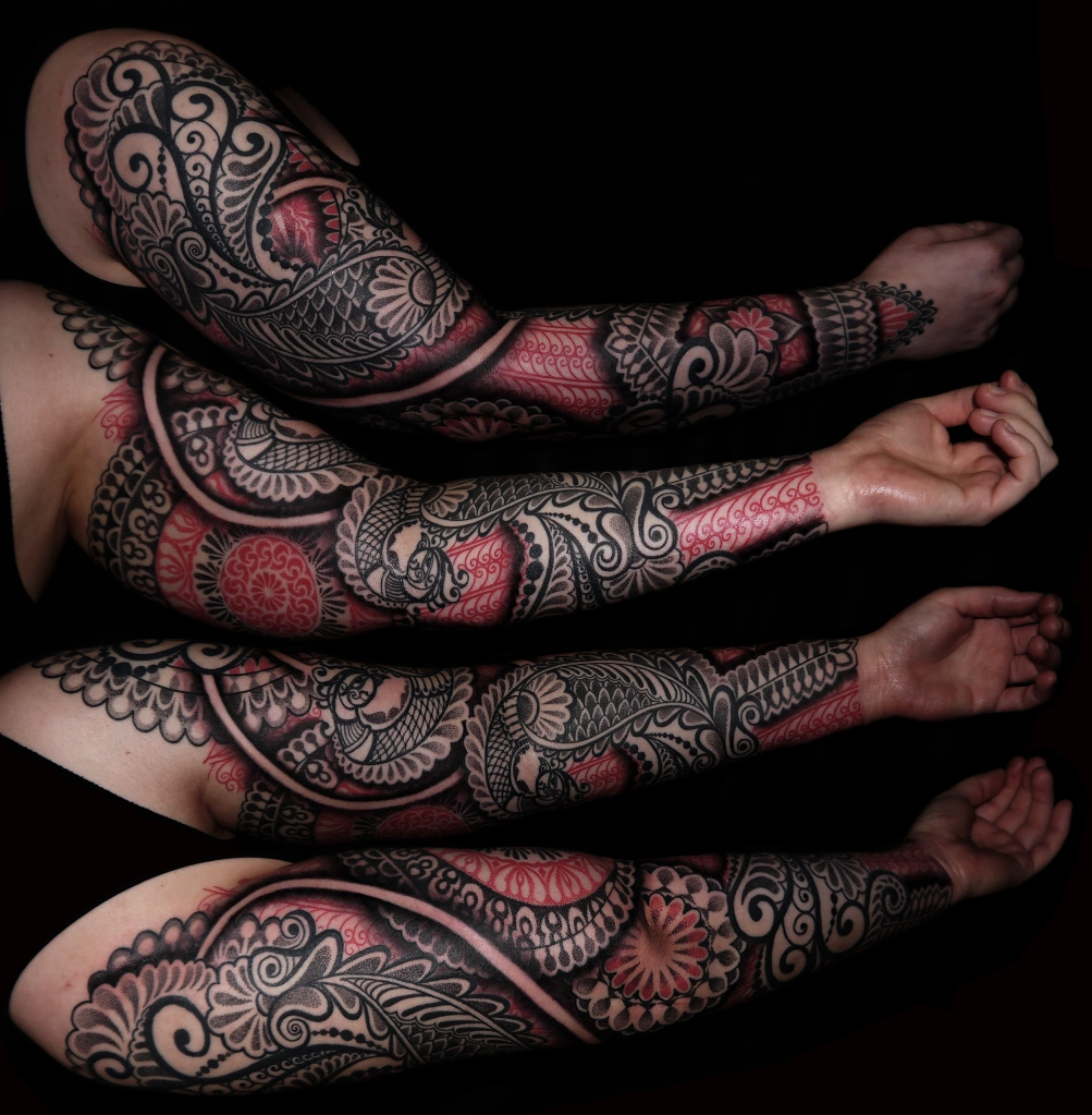Sie hat sich im Laufe der Zeit verändert. Als ich anfing, waren es die Leidenschaft und die Aufregung, die alles Neue mit sich bringt. Das wurde schnell von dem intensiven Wunsch abgelöst, technisch versiert zu sein. Zu diesem Zeitpunkt war meine Philosophie des Tätowierens nicht viel anders als die eines Tischlers über einen Sessel. Ich glaube immer noch, dass Tätowieren in erster Linie ein Handwerk und erst in zweiter Linie eine Kunstform ist. Es gibt nur sehr wenige Menschen, die vom einen zum anderen übergegangen sind, ohne dabei etwas zu verlieren. Meine Absicht ist es, denselben Weg zu gehen.