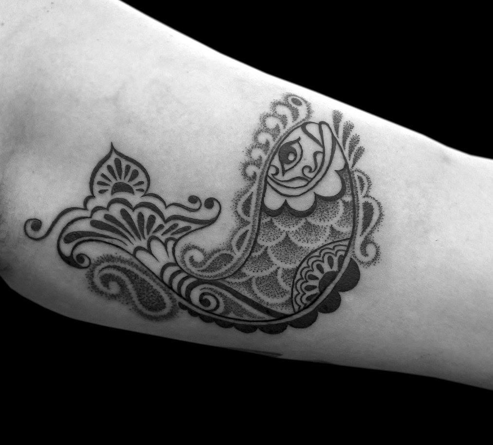Alles begann mit einer Zeichnung eines Fisches. Für einen Bengalen kann es nicht klischeehafter werden als das. Ich hatte eine unvollendete Zeichnung eines alpana-inspirierten Fisches in einem meiner Zeichenbücher – die nur aus Langeweile gezeichnet wurde und nicht dazu gedacht war, auf jemandem tätowiert zu werden. Auf einer Convention in Phuket, Thailand, im Jahr 2015, kurz bevor ich am letzten Tag alles zusammenpacken wollte, kam eine amerikanische Dame, die durch meine Zeichenbücher blätterte, zu mir und wollte dieses Fischdesign auf sich tätowiert haben. Es war überraschend, denn ich sah, dass sie bereits viele sehr hochwertige Tattoos hatte, und die Zeichnung, die sie gewählt hatte, war nicht einmal fertig. Sie war eindeutig sehr gut in ihrem Tattoo-Wissen. Aber sie sagte, sie habe noch nie ein Fischdesign gesehen, das so war wie meins. Also tätowierte ich diesen Fisch auf sie – und so begann der Bongo-Stil.